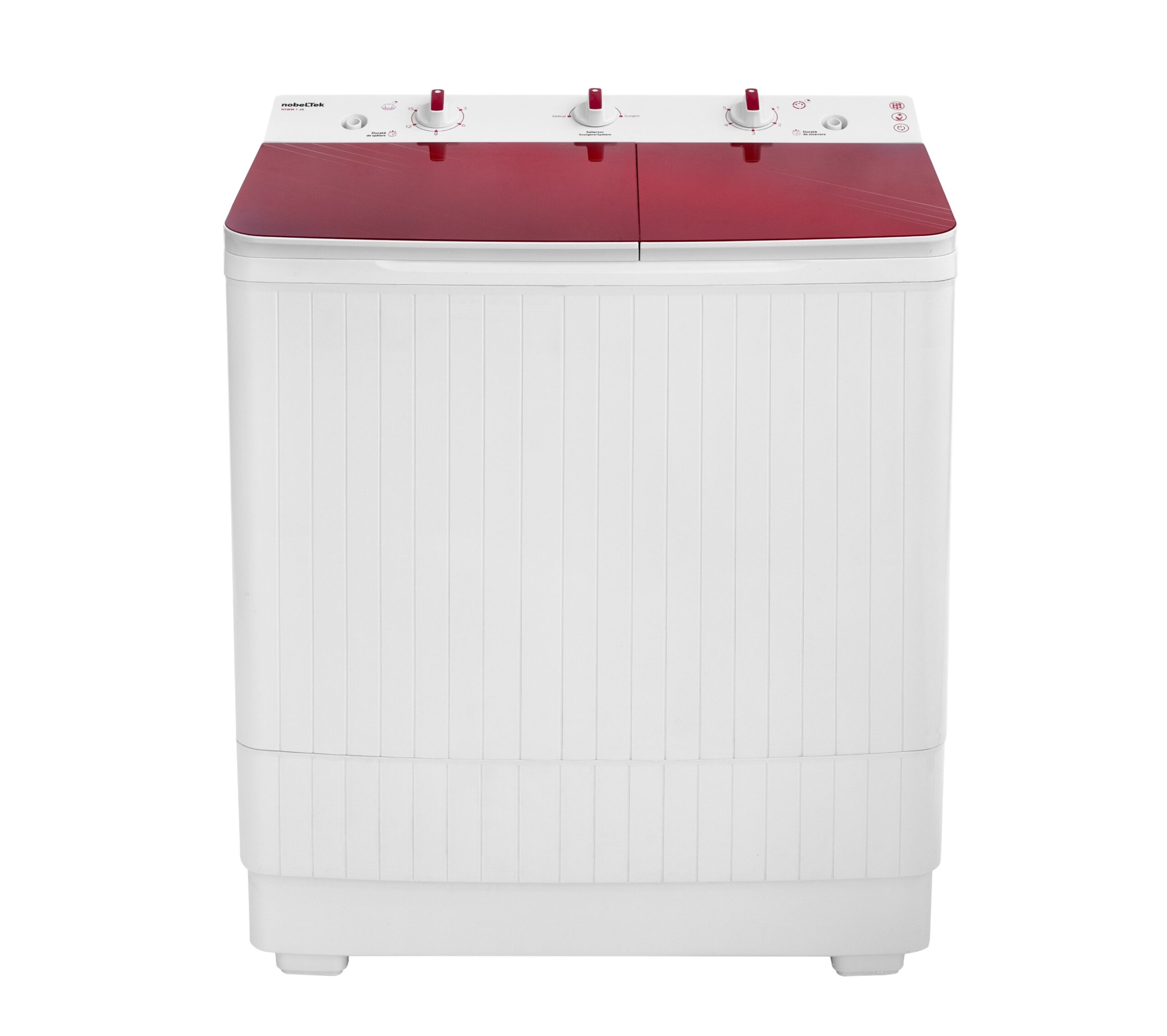 Masina de spalat rufe semi-automata Nobeltek NSWM 7.3R, 7 kg spalare, 3 kg stoarecere, evacuare apa uzata: prin cadere libera, Alb/Glass Line Red